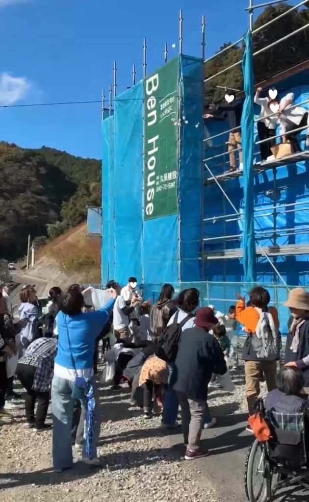 餅まきは建物のお披露目、周囲の方々に幸せのお裾分けをする意味を込めて行います。