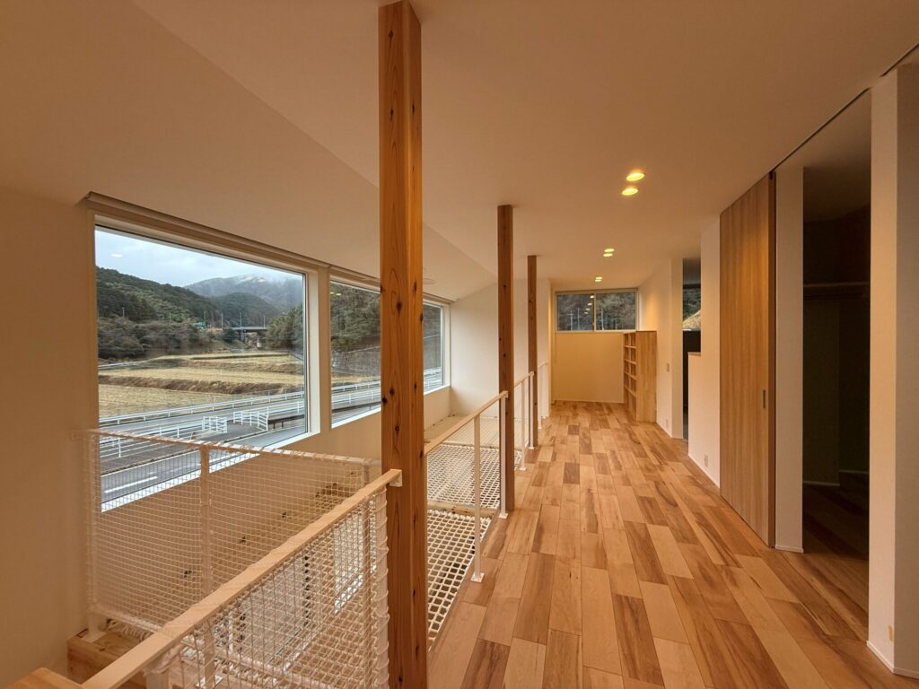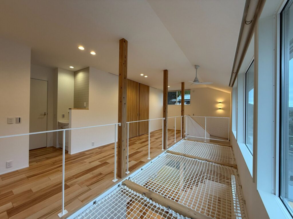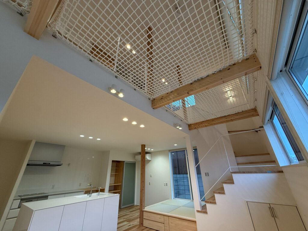 吹き抜けに設置されたアスレチックネットは、この住まいならではの象徴的な要素