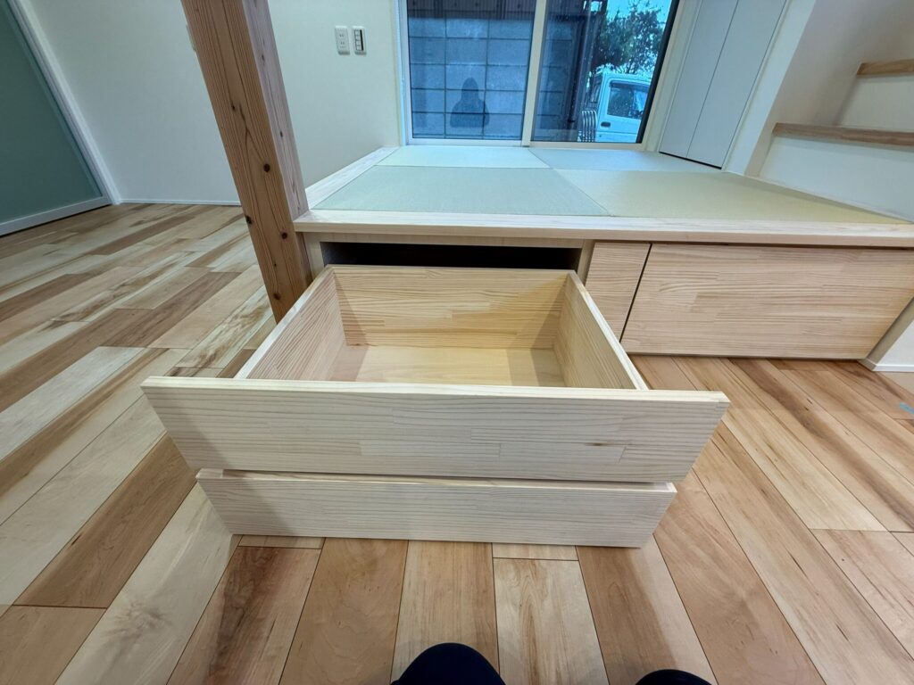 くつろぎの場であり、階段の一部でもある多機能な設えが、限られた空間を立体的に活用します